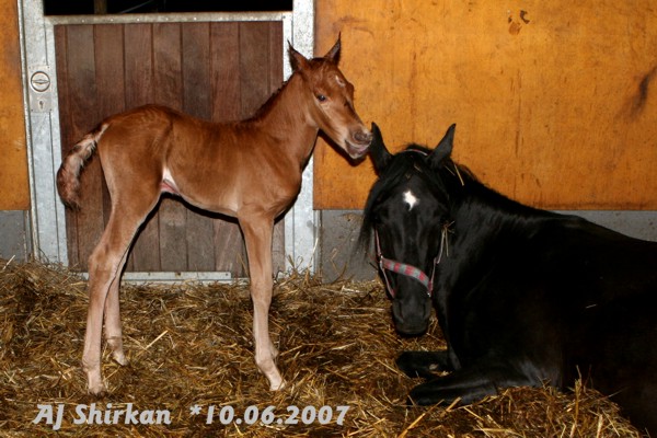 Am 10. Juni um ca. 4:30 Uhr hat Skarabell ein Hengstfohlen mit dem Namen AJ Shirkan zur Welt gebracht. Wie immer bei Skarabell gab es keine  Probleme. Shirkan mischt inzwischen unsere Herde ganz schön auf, er hat vor nichts und niemandem Angst.