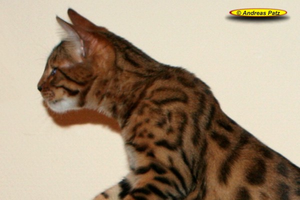 Wir hatten Design Me als Zuchtkatze einer netten Züchterin angeboten. Als diese sich nicht entscheiden konnte, haben wir beschlossen Design Me zu behalten. Dies hat sich als absoluter Glücksgriff sowohl von ihrer Qualität als auch vom Charakter herausgestellt. Sie hat einen tollen Kopf und einen sehr muskulösen idealen Körperbau. Sie hat sehr viel Glitter - soviel haben wir an noch keiner Bengalkatze gesehen. Leider ist das auf den Fotos nicht zu erkennen.
